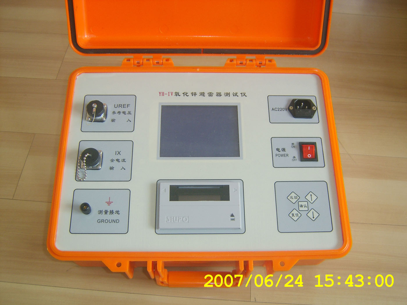一、概述: YH-Ⅳ智能氧化锌避雷器测试仪用于氧化锌[MOA] 泄漏电流的测量分析。主要是用于测量阻性电流,从而分析氧化锌老化和受潮的程度。现场带电测试符合中华人民共和国电力行业标准《DL474.5—92现场绝缘试验实施导则—避雷器试验》的要术。也可用于实验室做出厂和验收试验。 二、主要技术指标: 参考电压输入范围(峰值): 10-400V 全泄漏电流测量范围(峰值): 0-10mA 阻性电流测量范围(峰值): 0-10mA 容性电流测量范围(峰值): 0-10mA 角度测量范围: 0·-360· 功耗: 4W 系统测量准确度: ±(读数´5% + 5个字) 交流电源: AC 220V ±10%,50Hz ±1%